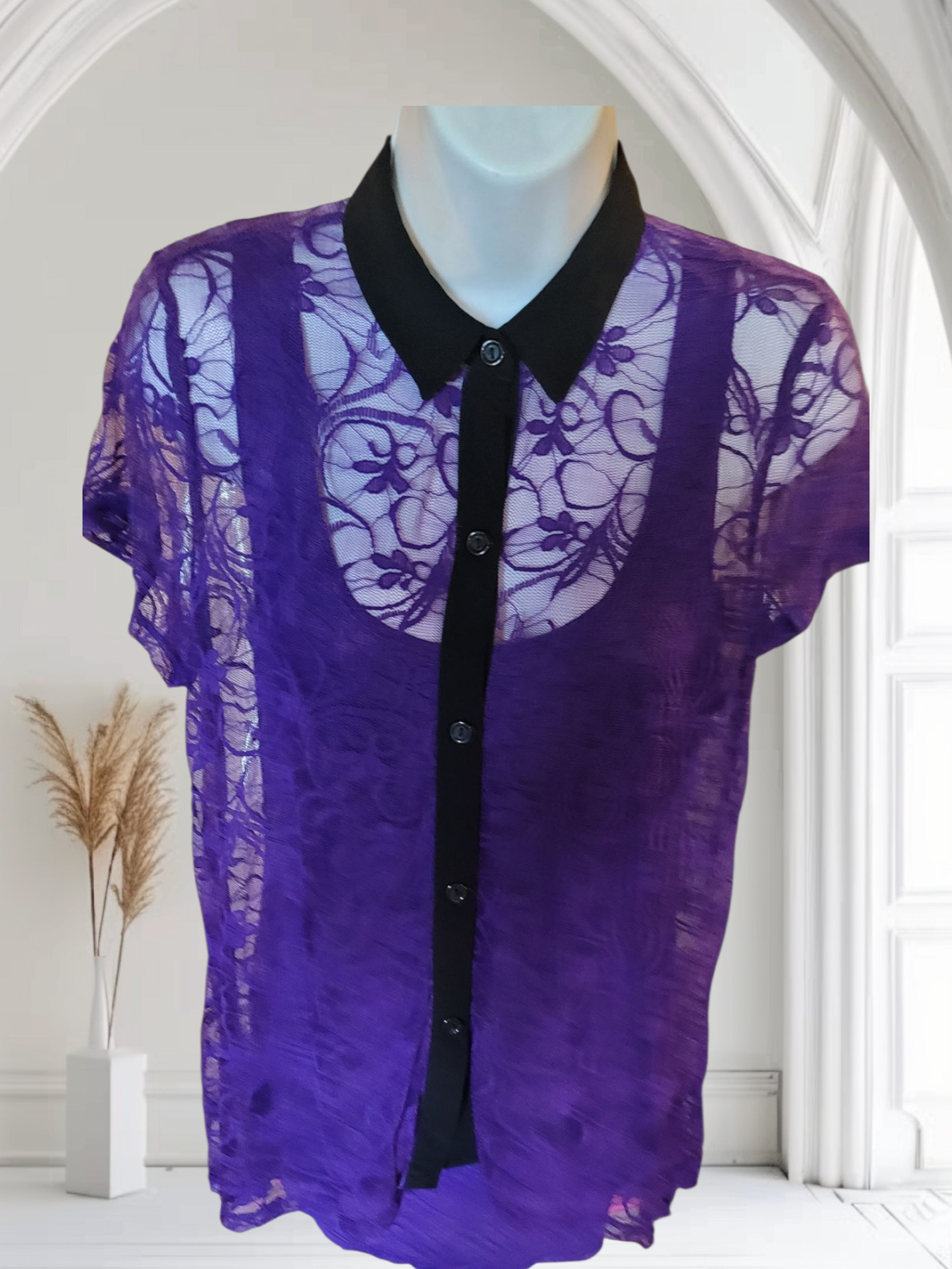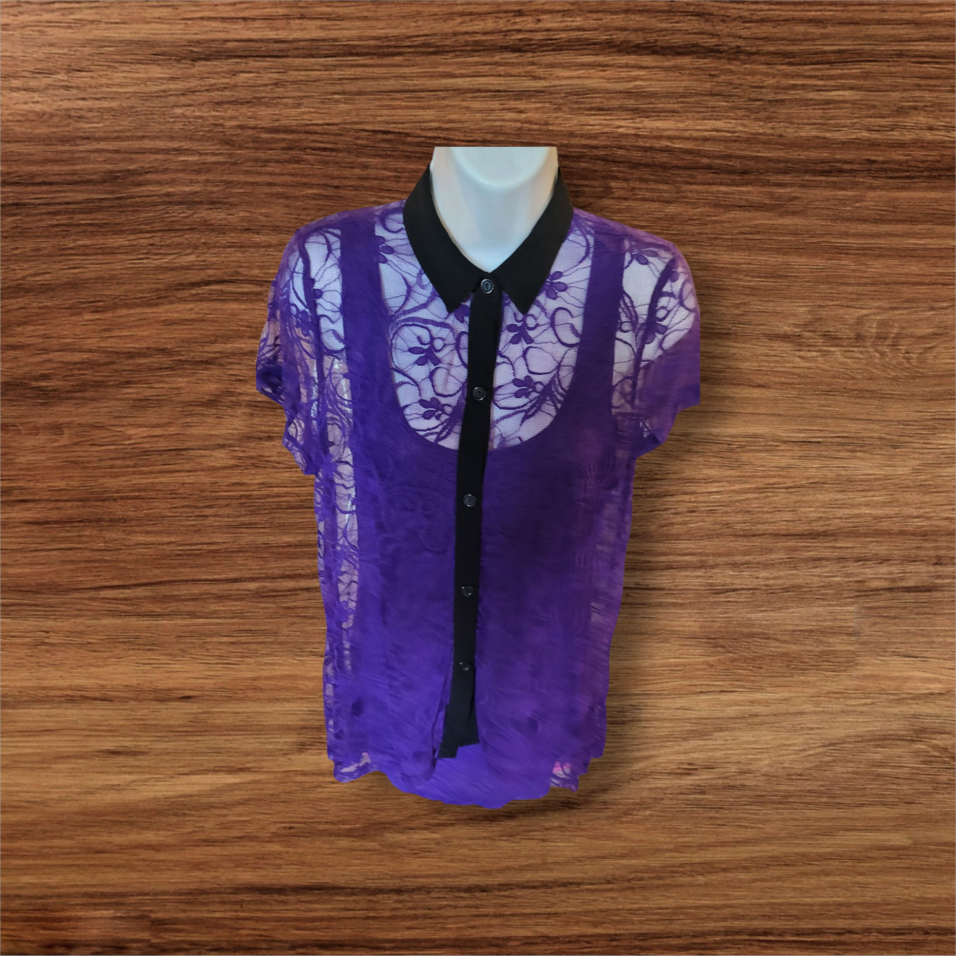 *Product Information: purple lace shirt with black collar on. With inside liner.