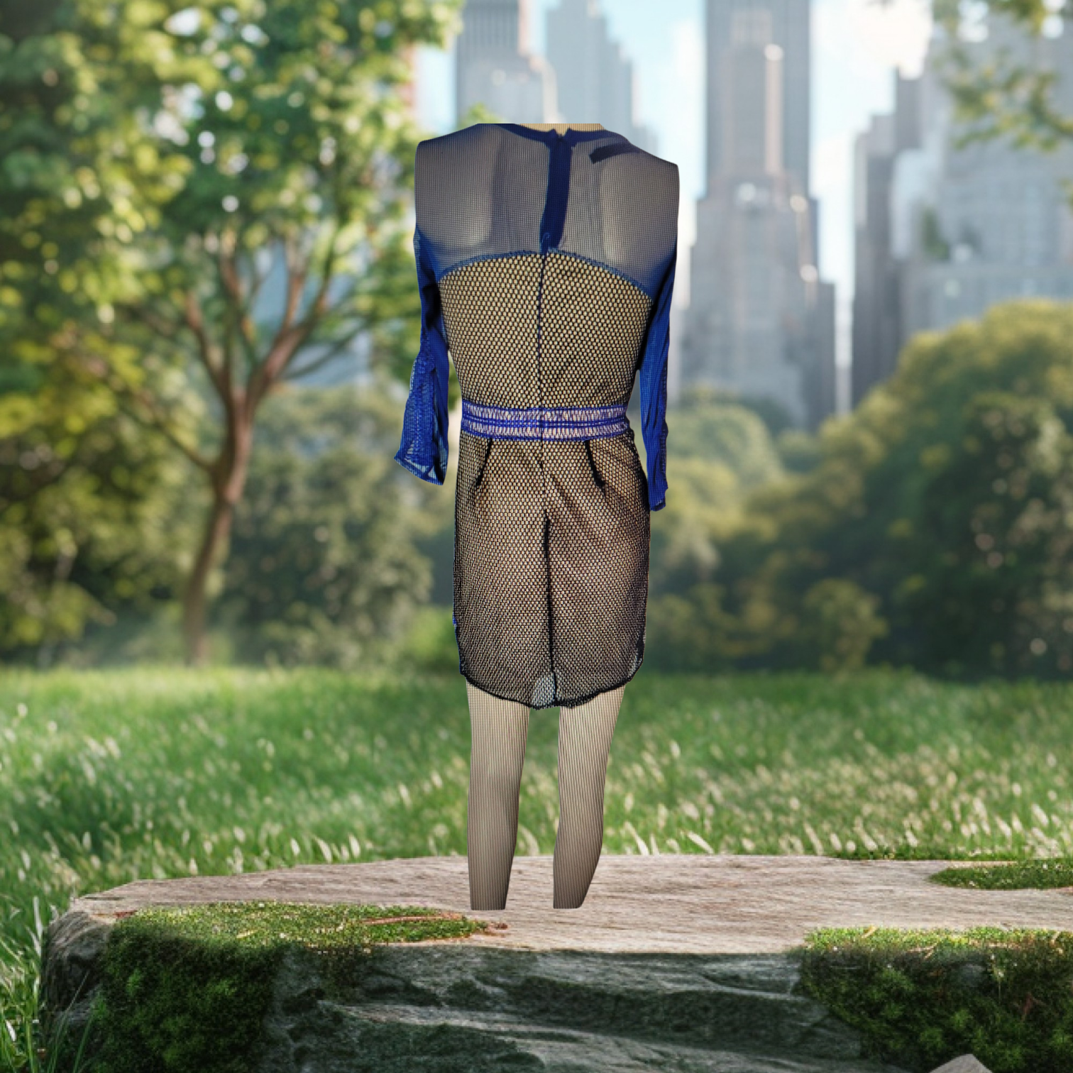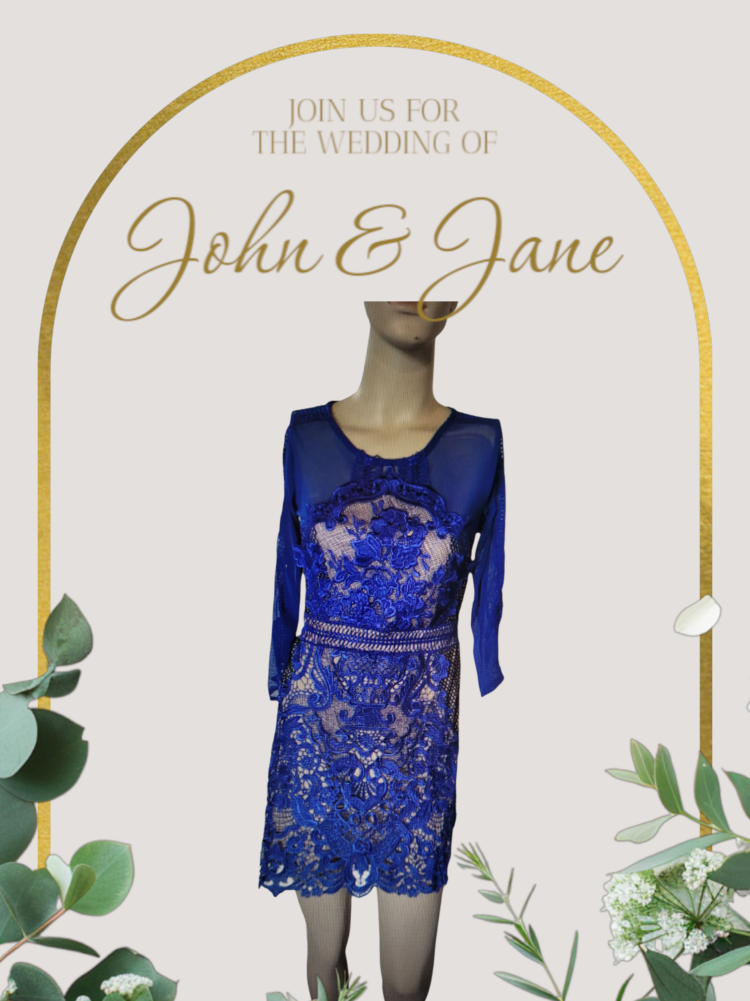 BLUE LACE DRESS ON MANNEQUIEN AGINST A NEUTRAL BACKGROUND