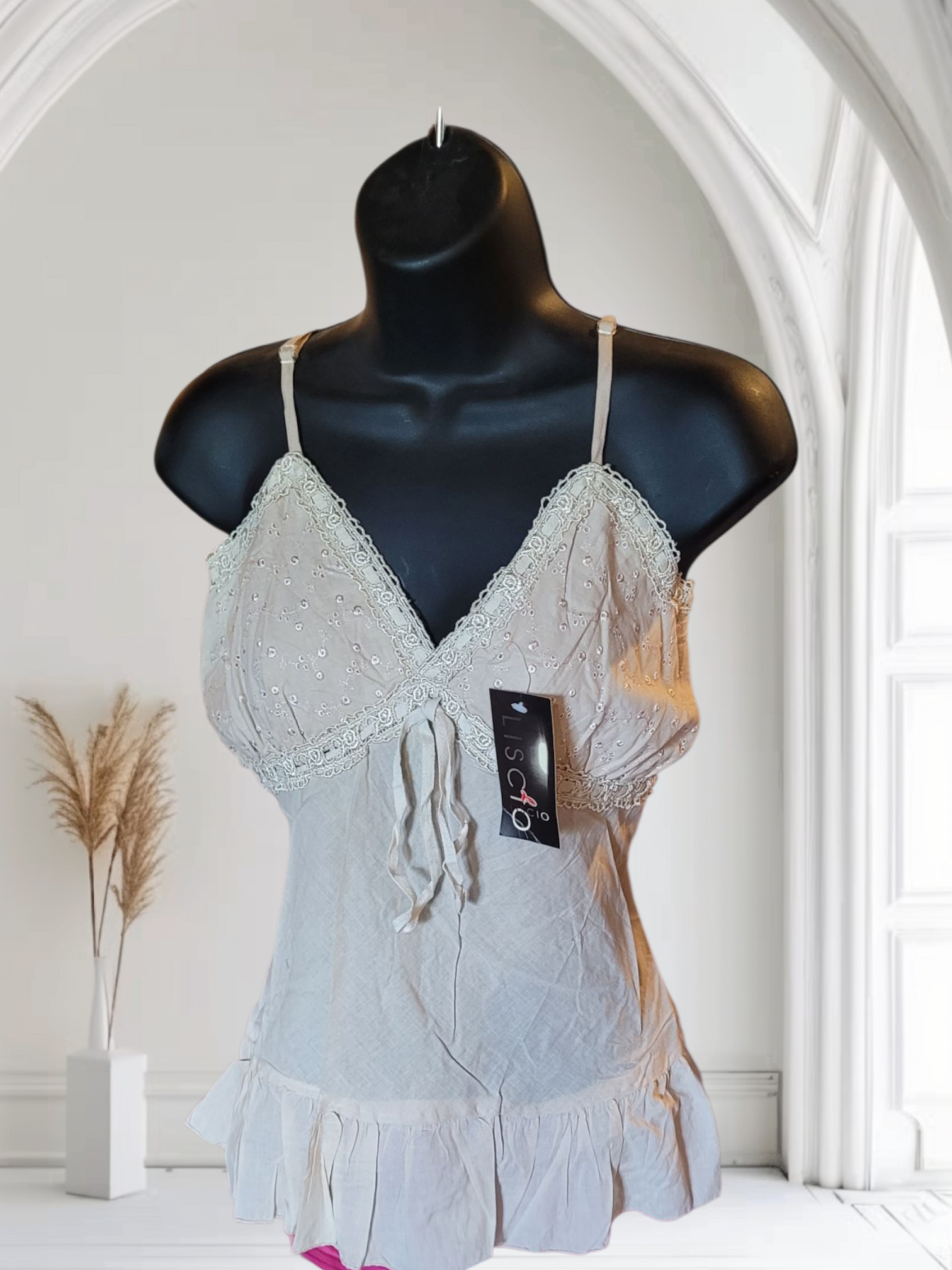 This summer top features a delicate Coresia net panel on the front, offering breathable comfort and a modern textured look. Its lightweight design ensures ease and style for warm weather wear, making it a refined choice for casual or chic summer outfits.